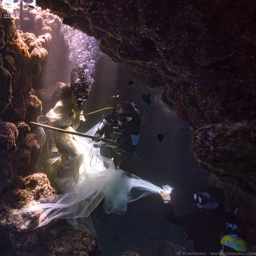 드레스가 자연스럽게 흘러내리도록 정리해주는 다이버와 지팡이를 들고 수중모델이 보조호흡기로 호흡할 수 있게 도와주는 다이버 등 팀워크가 필요했다.마침내 상어들 중의 한 마리가 동굴 깊숙이 들어와서 멋진 사진을 촬영할 수 있는 기회를 주었다. 모델인 앰버는 깊은 숨을 들이쉰 다음에 마스크를 벗었으며, 할 수
