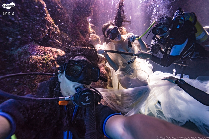 작업을 성공적으로 마무리하고 수중모델, 서포트 다이버와 함께 셀카를 촬영하는 본 웡