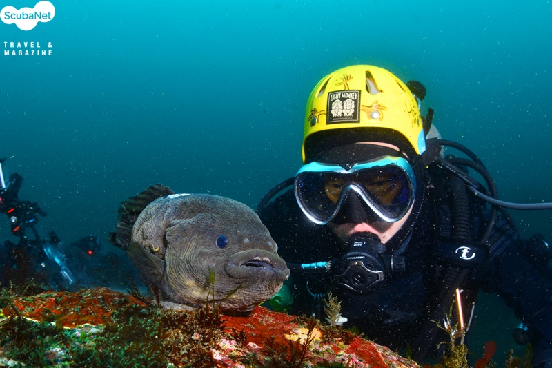배의 흡반을 이용해 바위에 붙어 있는 도치와 다이버.