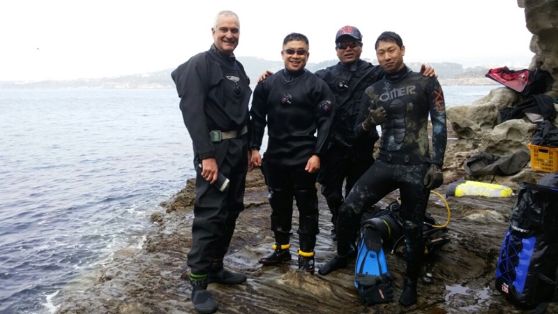 문섬에서 함께 한 다이버들. 왼쪽부터 랄프 강사, 조현수 강사. 필자, 여영수