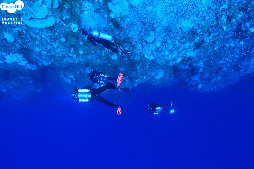 콰젤란에서 비키니로 가는 중간에 월다이빙을 즐기는 다이버들