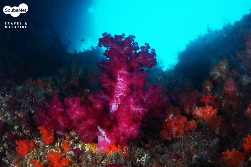 쌍굴 절벽을 장식하고 있는 연산호들의 폴립이 활짝 피어 있다.
