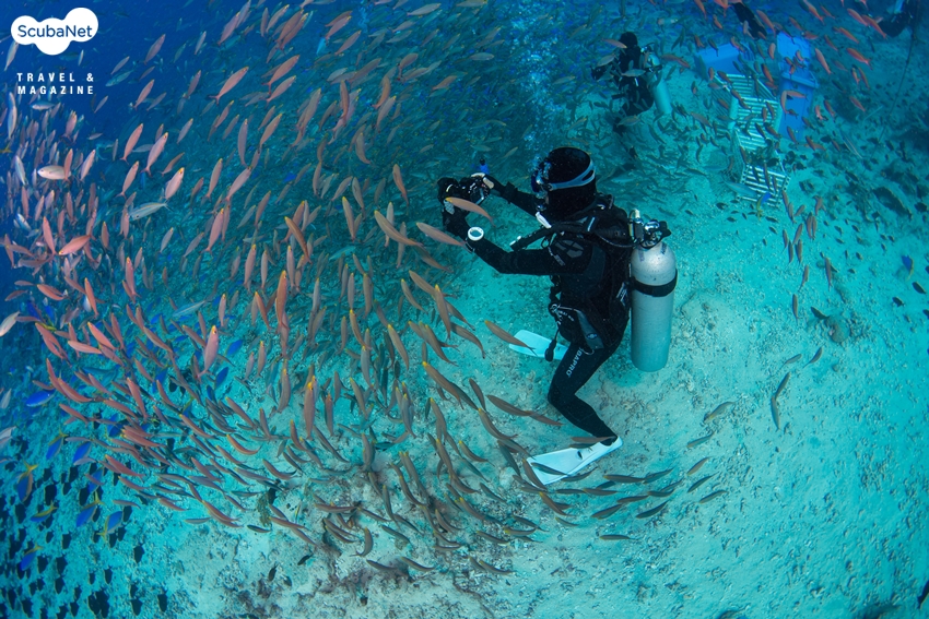 카테드랄의 물고기 떼와 다이버들