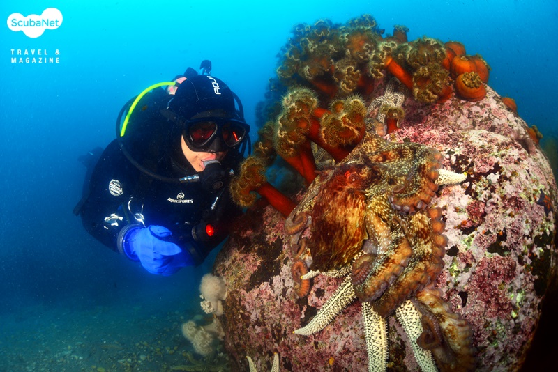 위장하고 있는 문어를 가까이 보고 있는 다이버