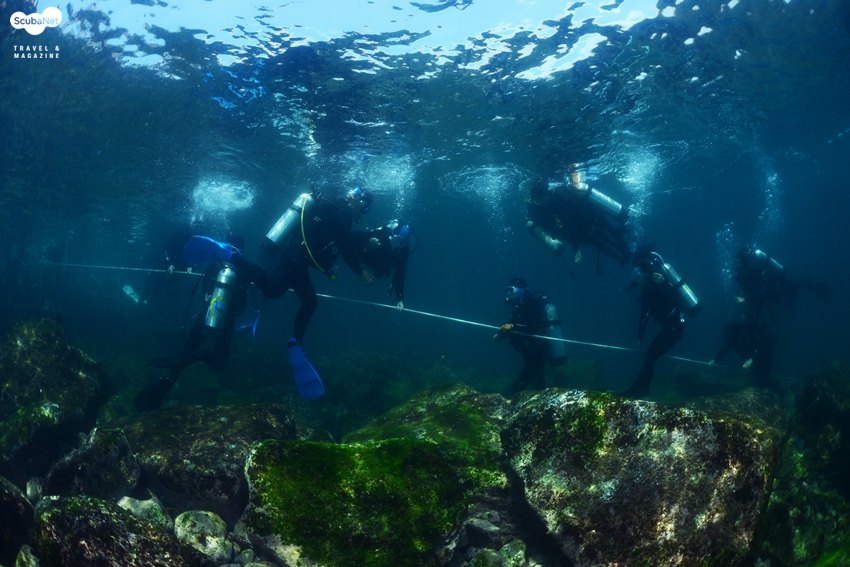 수중의 가이드라인을 잡고 이동하는 체험 다이버들과 초보자들