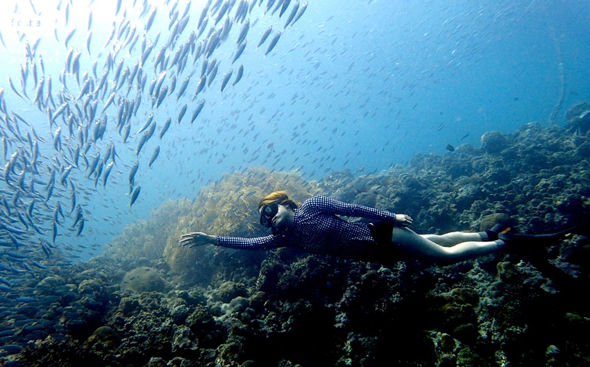 정어리 무리 사이로 자유롭게 다이빙을 즐기는 프리다이버