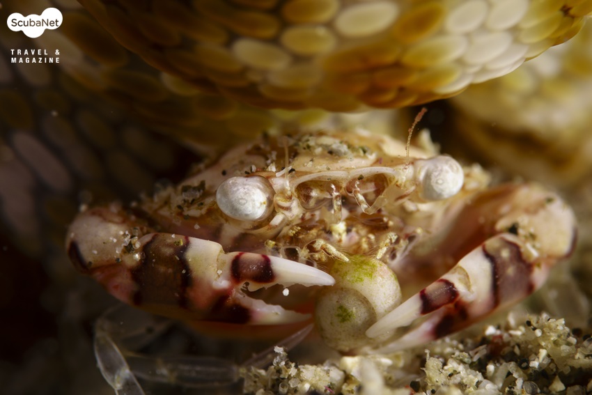 말미잘 아래에 숨어있는 공생게를 마크로 컨버전 렌즈를 사용하여 촬영한 사진. 배율이 높은 렌즈를 사용하면서 줌을 최대로 당기고 오토포커스로 촬영하였다. Anilao, Philippines. Sony RX100, Patima housing, 2 x Sea&Sea YS-D1 strobe, Noodilab moby macro conversion lens, M mode, AWB, f11, 1/2000s, ISO 100