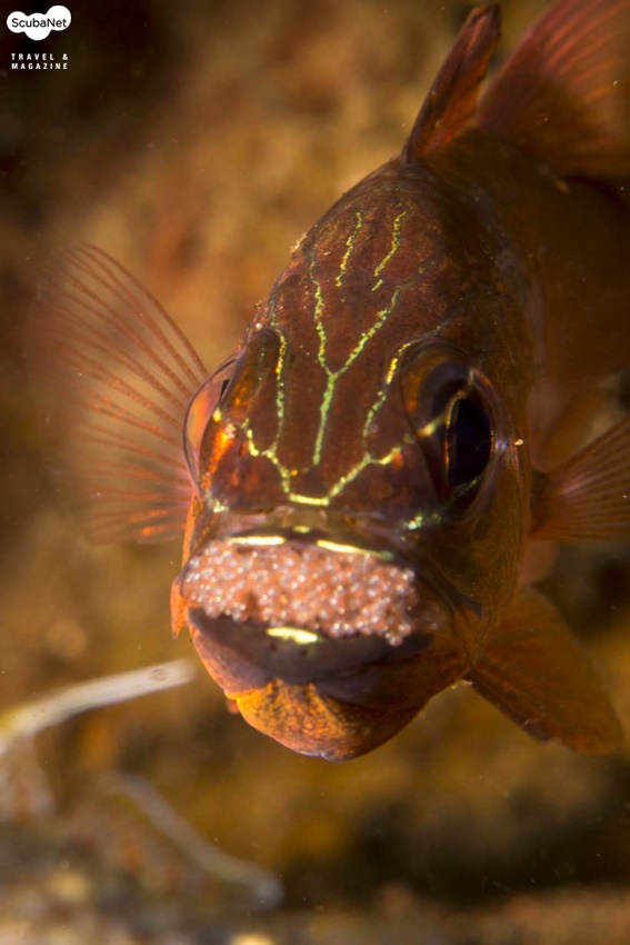 알을 입에 물고 부화시키는 카디널피시가 산소를 공급하기 위해 입을 벌리는 순간을 포착한 사진. Dumaguete, Philippines. Sony RX100, Patima housing, 2x Sea&Sea YS-D1 strobe, Inon UCL165-M67 Macro conversion lens, M mode, AWB, f11, 1/25s, ISO 100