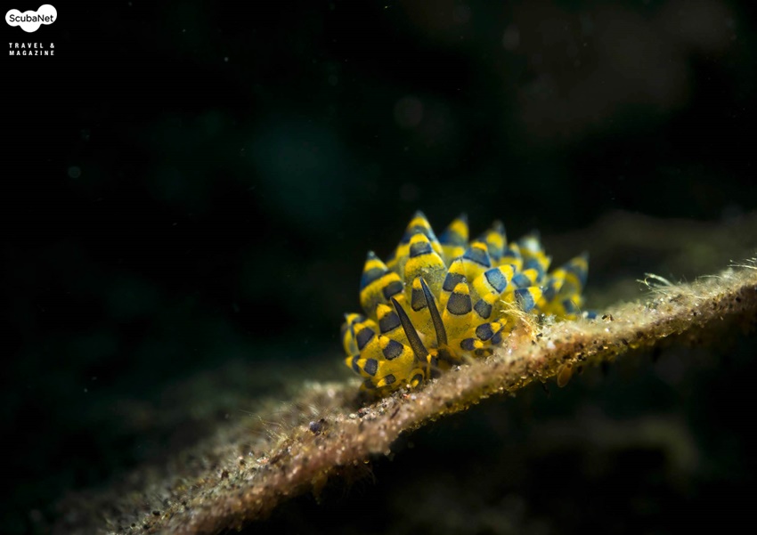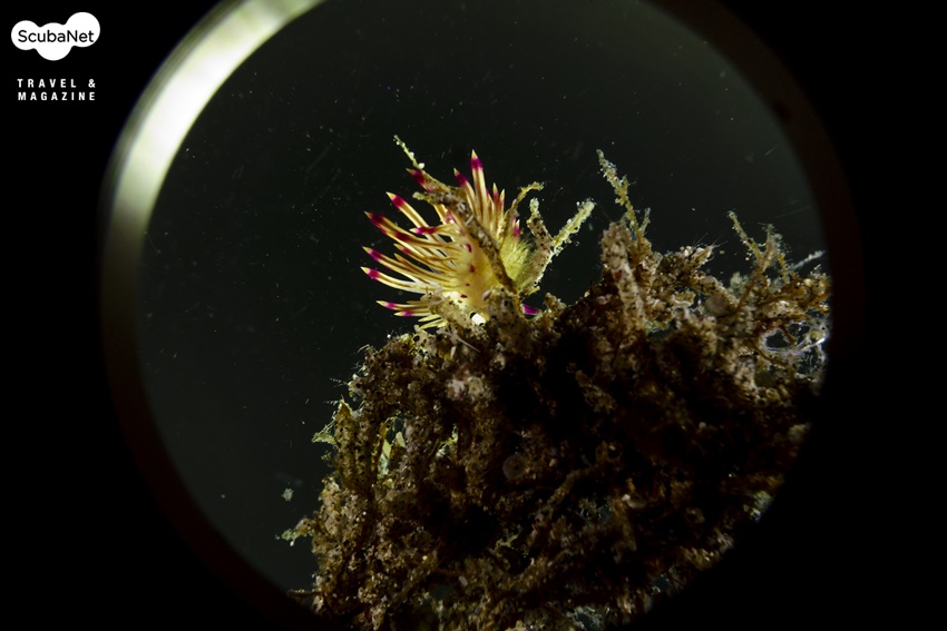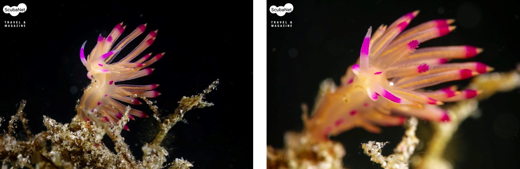 조류 위에 올라가 있는 Flabellina 갯민숭달팽이를 마크로 컨버전렌즈를 이용하여 배경을 검게 처리하여 촬영한 사진으로 조리개값은 동일하지만 근접하면 심도가 얕아지는 것을 비교해볼 수 있다. Anilao, Philippines. Sony RX100, Patima housing, 2x Sea&Sea YS-D1 strobe, M mode, AWB, f11, 1/2000s, ISO 100 (왼쪽) Inon UCL165+330M67 Macro conversion lens, (오른쪽) Aquako No.4 Macro conversion lens