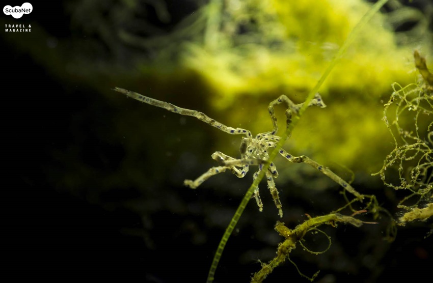 바닥에 있는 해조류 위에 있는 Sea spider를 마크로 컨버전렌즈를 장착하고 백라이트로 촬영한 사진. Dumaguete, Philippines. Sony RX100, Patima housing, 2 x Sea&Sea YS-D1 strobe, Inon Aquako No.4 Macro conversion lens, M mode, AWB, f11, 1/2000s, ISO 100
