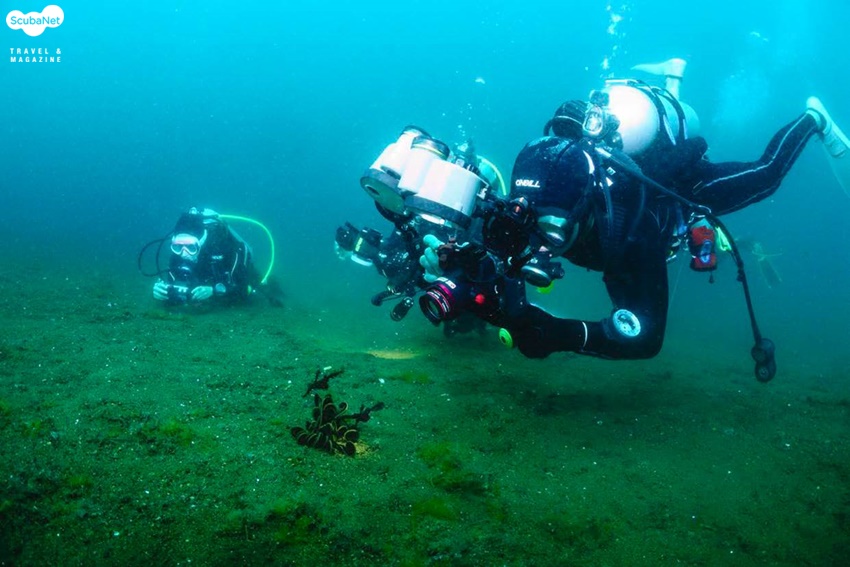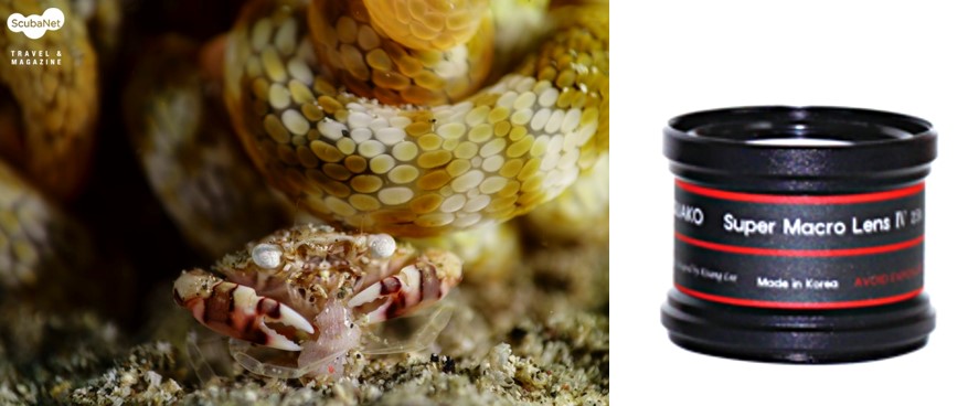 위하여 아쿠아코 마크로 컨버전렌즈르 부착하고 촬영하는 다이버. 모델: