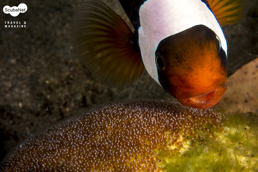 위하여 가슴지느러미와 입으로 불어주는 아네모네 피시를 촬영한 사진. Dumaguete, Philippines.