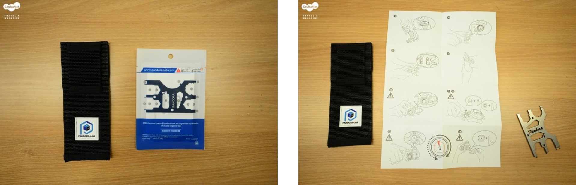 (왼쪽) 판도라 파우치와 비닐포장 제품 - (오른쪽) 비닐포장지 내부 구성품은 사용설명 그림과 판도라 툴이다.