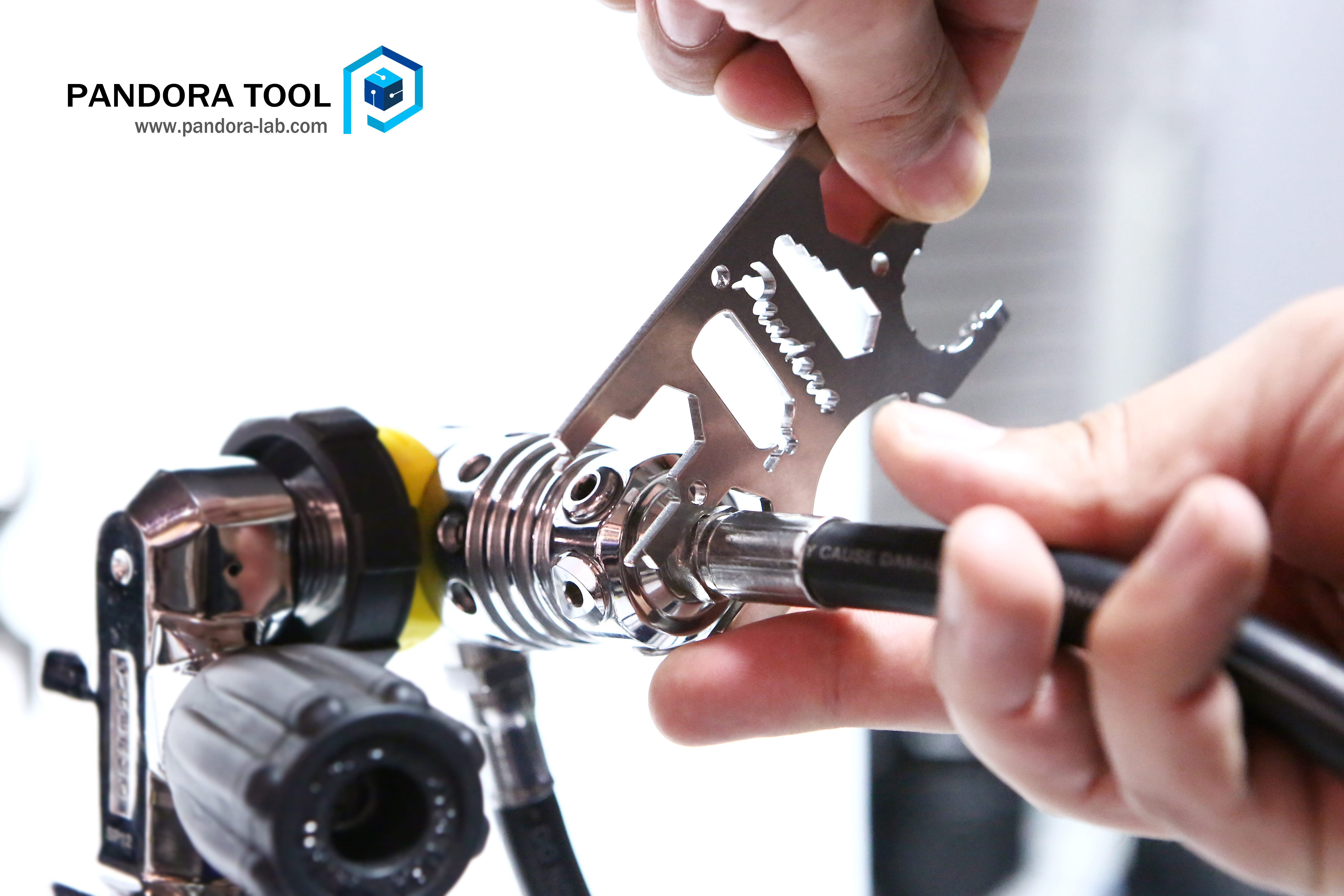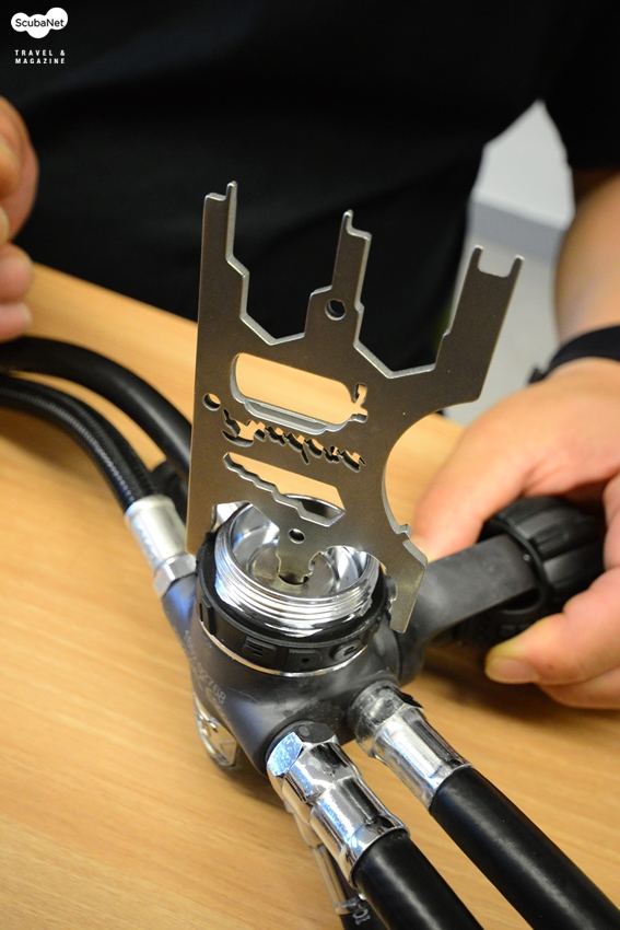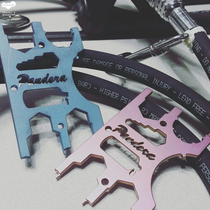 판도라 툴은 스쿠버 레귤레이터 1, 2단계와 잔압계, BC 인플레이터, 탱크 밸브 등을 다른 장비 없이도 현장에서 간단하게