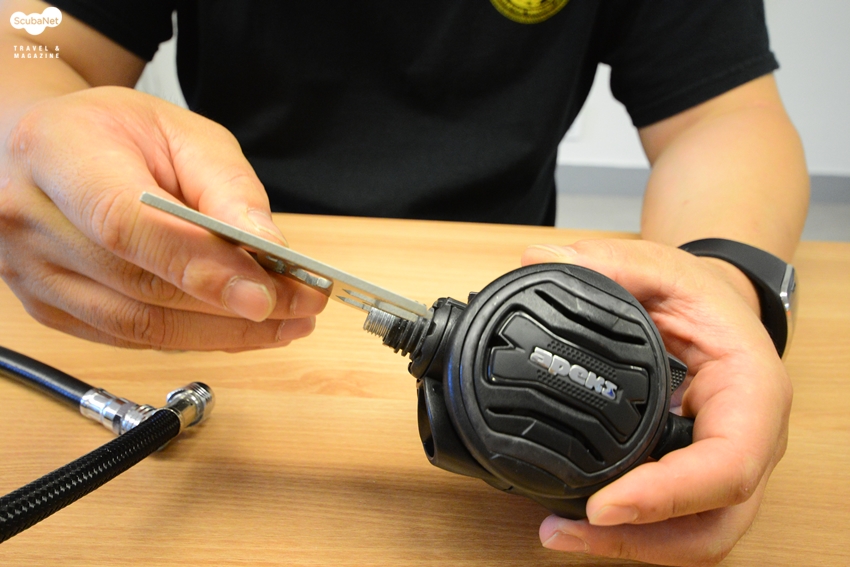 레귤레이터 2단계의 프리플로우를 막거나 호흡저항을 조절하기 위해 2단계의 흐름조정을 할 때 2단계를 호스에서 분해하여 포핏의 간격을