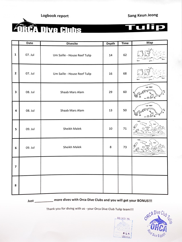 듀공 다이빙은 인원이 적었음에도 별도의 밴과 트럭을 배정하여 편의를 제공해주어 고마웠다. 다이빙 일정을 마치고 정산을 끝내니 깔끔하게 프린트된 로그 페이퍼를 건낸다. 3일 동안 오르카에서 다이빙한 내역과 포인트맵이 들어가 있다. 여기서
