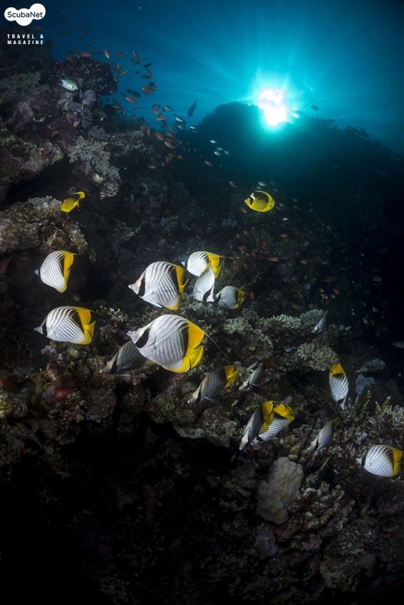 무리가 춤을 춘다. 짝을 지은 나비고기와 무어리시아이돌과 함께 커다란 옐로우 트리거피시가 영역을 지키고