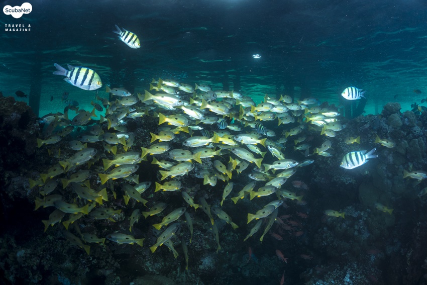 있다. 제티 아래에는 뜨거운 햇살을 피해 멸치떼와 학공치 무리와 함께 코넷피시가 무리지어 있다. 다이브숍에서 휴식 후에 2차 다이빙은 직벽을 따라 여유있게 이동하면서
