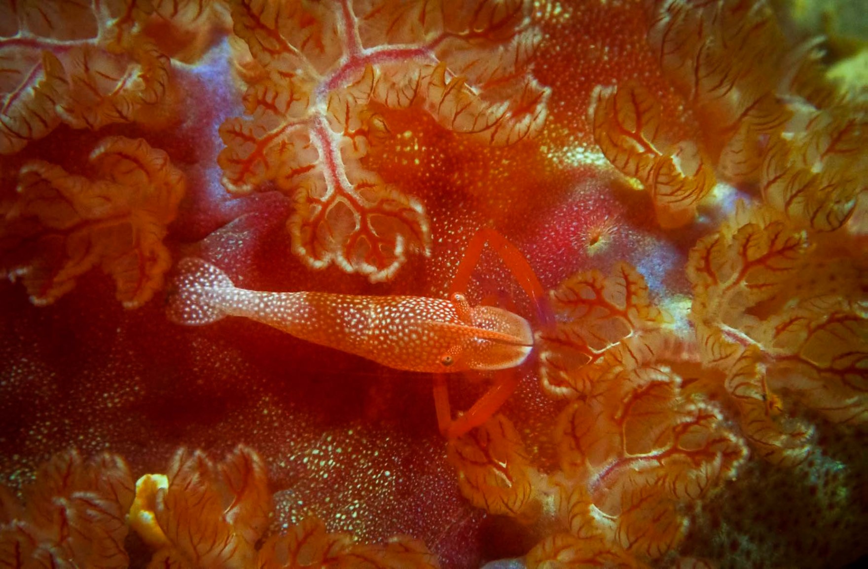 스페니쉬댄서에 공생하는 크라운 쉬림프를 TTL모드 스트로브광으로 촬영한 사진. 배경을 평면적으로 표현하기 위해 좌우 스트로브의 광량을 비슷하게 조광하였다. Anilao, Philippines. Olympus TG4, Olympus housing, 2x Olympus UFL-3 strobe RC, 수중접사 mode, 플래시보정 -1.332, f6.3, 1/200s, ISO 200