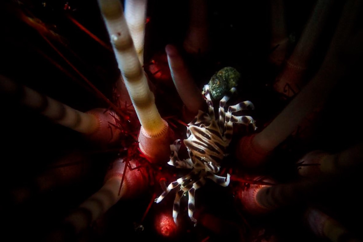성게에 공생하는 작은 게를 스눗을 이용하여 촬영한 사진. 스눗을 활용하여 TTL로 촬영하기 위하여 스트로브 광량을 적게 보정하였다. Anilao, Philippines. Olympus TG4, Olympus housing, Sea&Sea YD-D1 with Snoot, Olympus UFL-3 strobe RC, 수중접사 mode, 플래시보정 -1.332, f6.3, 1/200s, ISO 200