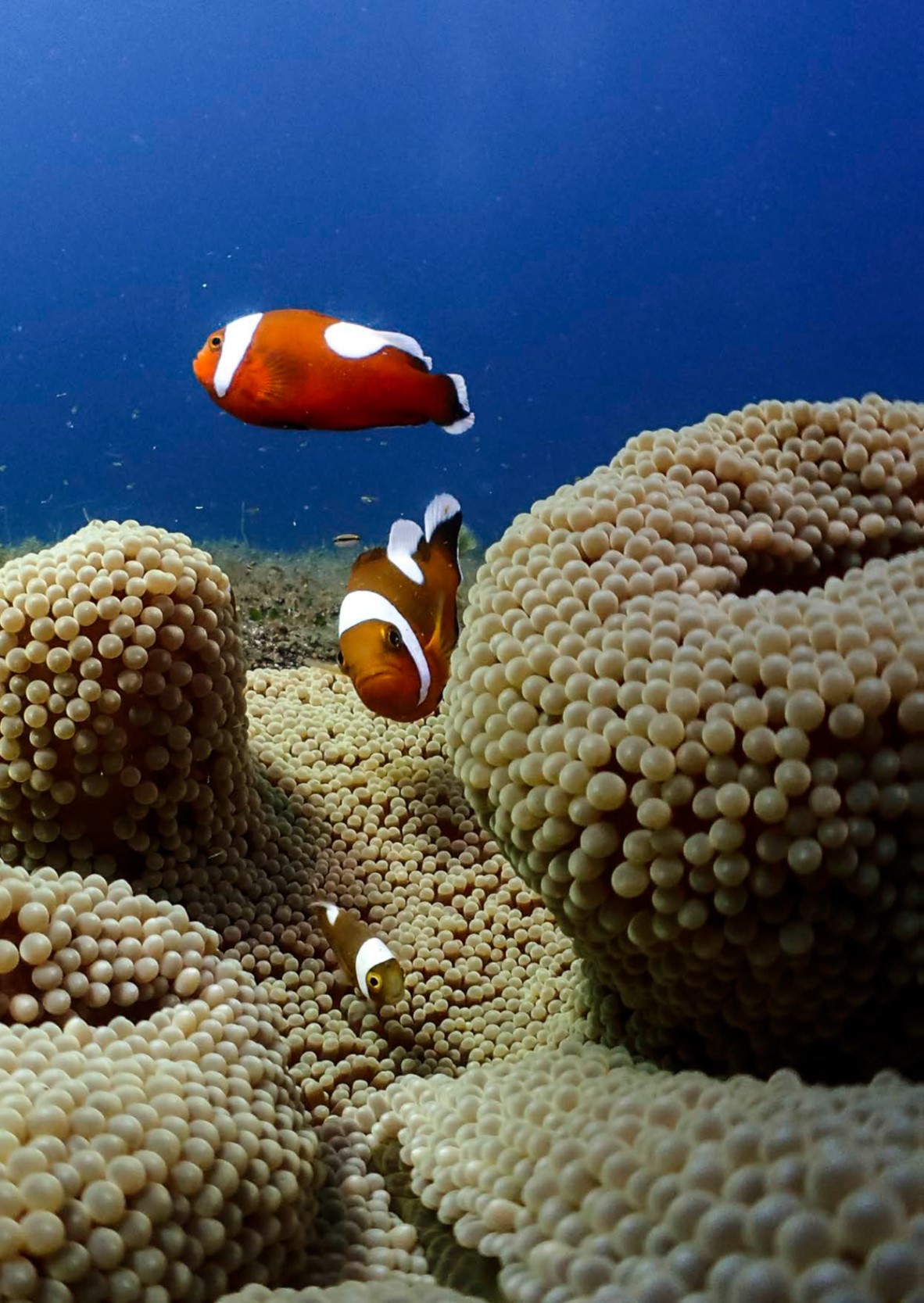 말미잘에 공생하는 아네모네 피시를 마크로 피시아이렌즈를 이용하여 최대한 접근하여 촬영한 사진. 배경 물색을 최대한 살리고 아네모네 피시에 외장스트로브를 TTL모드로 조광하였다. Anilao, Philippines. Olympus TG4, Olympus housing, Inon UWL-M150 ZM80 micro fisheye lens, 2x Olympus UFL-3 strobe RC, 수중광각1 mode, f6.3, 1/320s, ISO 200