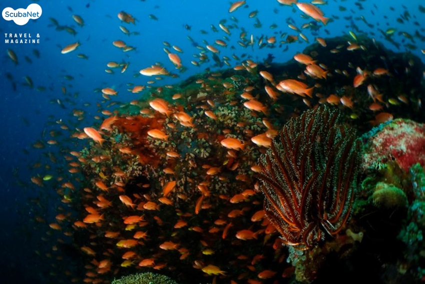 산호초에 조류를 받으며 모여있는 안티아스 무리를 외장스트로브를 TTL로 동조하여 촬영한 사진. 물색을 짙게 하기 위하여 노출을 -1로, 안티아스가 밝게 튀는 것을 방지하기 위하여 광량을 -1로 보정하였다. Anilao, Philippines. Olympus TG4, Olympus housing, Inon UWL-M150 ZM80 micro fisheye lens, 2x Olympus UFL-3 strobe RC, 수중광각1 mode, 노출보정 -1, 플래시보정 -1, f6.3, 1/200s, ISO 200