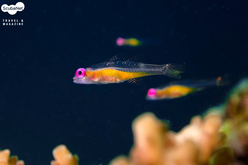 산호 주변에 모여있는 핑크아이고비를 검정 배경으로 촬영하기 위하여 노출을 최대한 부족하게 보정하고 TTL 모드로 스트로브광 위주로 촬영한 사진. Anilao, Philippines. Olympus TG4, Olympus housing, 2x Olympus UFL-3 strobe RC, 수중접사 mode, 노출보정 -1, f6.3, 1/400s, ISO 125