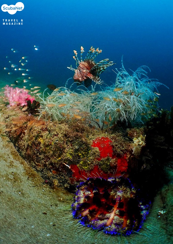Muck diving 지역의 작은 산호에 모여있는 글라스피시와 라이온피시를 스트로브를 TTL로 촬영한 사진. Anilao, Philippines. Olympus TG4, Olympus housing, Inon UWL-M150 ZM80 micro fisheye lens, 2x Olympus UFL-3 strobe RC, 수중광각1 mode, f6.3, 1/200s, ISO 200
