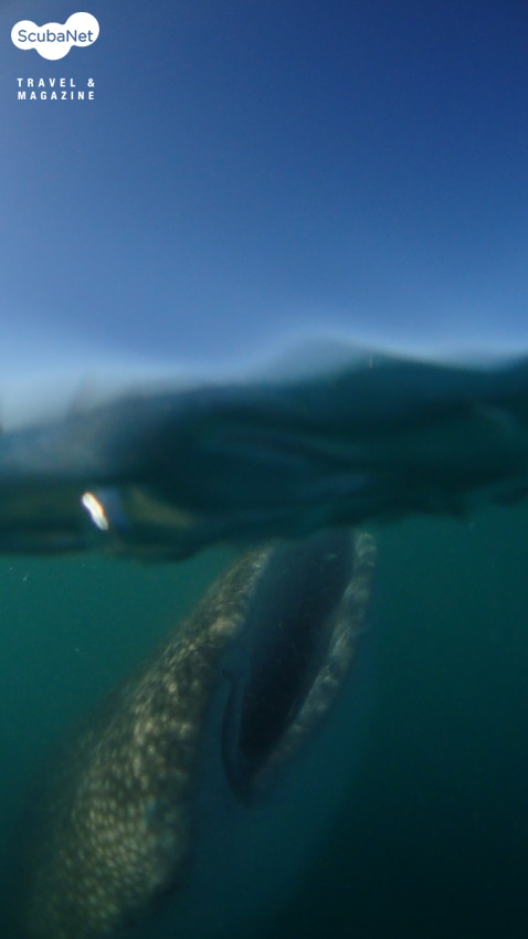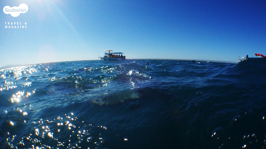 수중의 고래상어와 Fun Baja의 보트를 수면 위에서 촬영. F18, 1/400s,