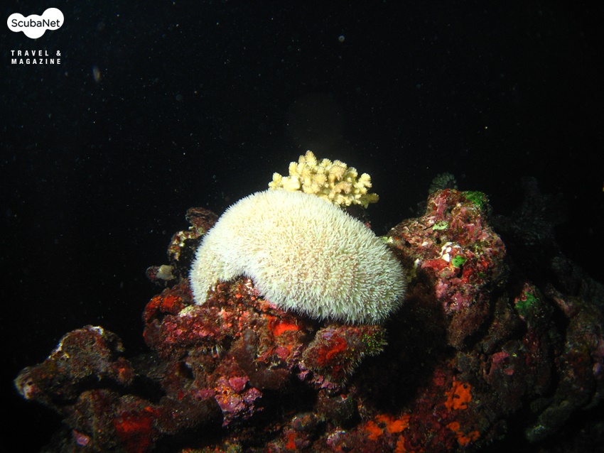 야간 다이빙에서 만난 폴립이 활짝 핀 접시산호