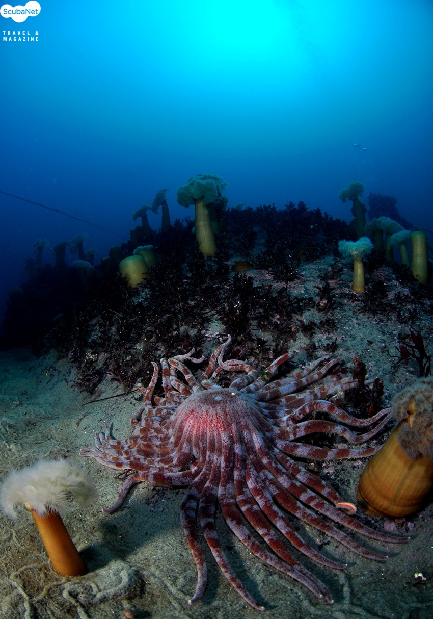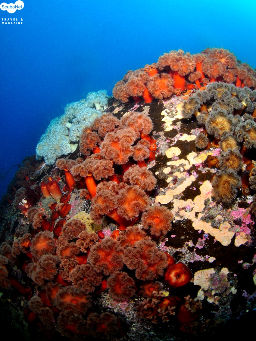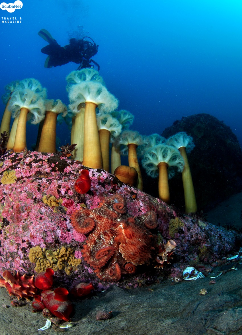 시크릿가든의 작은 암반에 피어있는 섬유세닐말미잘과 멍게인 듯 위장하고 있는 대왕문어