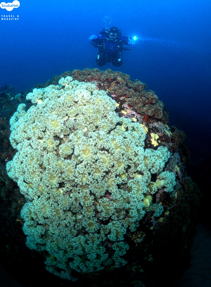동경 포인트 조도 동남쪽의 동경 포인트는 지난 연말에 한번 찾았던 곳이다. 당시에는 섬유세닐말미잘들이 활짝 피지 않아서 산란기를 맞은 쥐노래미들만 촬영했던 기억이 있다. 그러나 이번에 찾아간 동경 포인트는 느낌이 완전히 달랐다. 수심 24m 바닥 근처의 작은 짬들에는 섬유세닐 말미잘들이 몸통을 쭉쭉 펼치고 있었고, 수심 20m의 봉우리 정상 근처에 군락을 이루고 있는 화려한 색상의 말미잘들도 짧지만 최대한 몸을 활짝 펼치고 있었다. 이들은 한쪽은 흰색, 다른 쪽은 적갈색 그리고 또 다른 쪽은 녹갈색을 띠며 무리별로 모여 있어 마치 편 가르기를 하는 느낌이었다. 한창 수중사진 촬영에 맛을 들인 이종순 씨가 버디가 되어 함께 다이빙하면서 중요한 순간에 망설이지 않고 모델 역할을 해주었고, 이기영 강사는 직접 가이드를 하며 모델까지 해주었다. 두 사람에게 깊은 고마움을 느낀다.