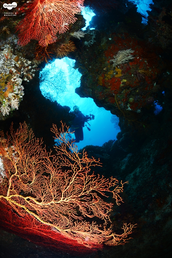 안내해준 곳이었다. 수중 봉우리 가운데 크게 구멍이 뚫려 있었는데 그곳에 부채산호들과 안티아스 무리들이