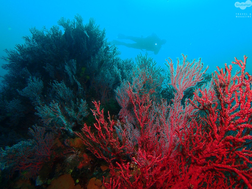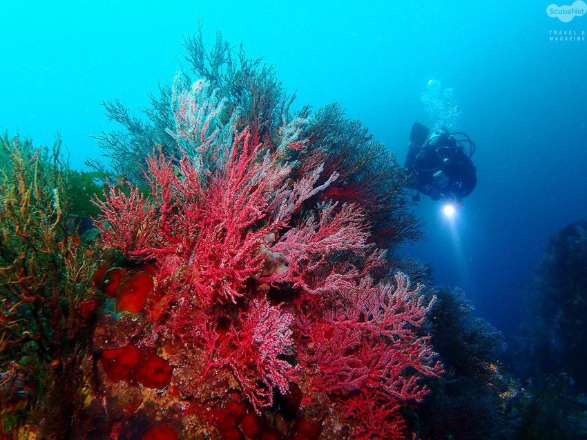 아닐까 생각하며, 여기 저기 돌아 다니면서 수중 랜턴을 이용해서 산호들을 구경했다. 파란 바닷속에서 랜턴을 비추니 나타나는 새빨간 산호의 모습에 점점 매료되어간다. 더군다나 시야가 좋아서 멀리 있는 다이버도 무엇을 하는지 잘 보인다.