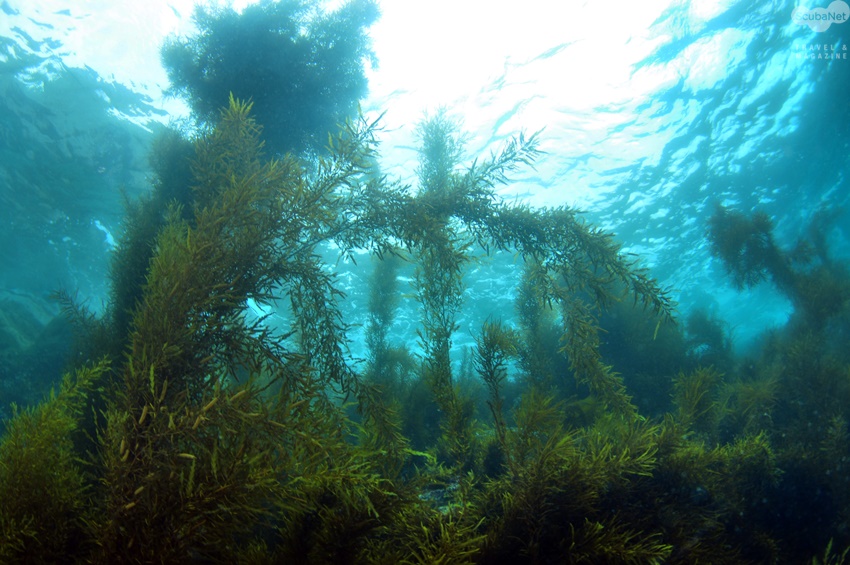 모자반 숲은 수심 15m 내외의 깊은 곳에서부터 새끼섬의 얕은 곳까지 무성하게 자라서 절정을