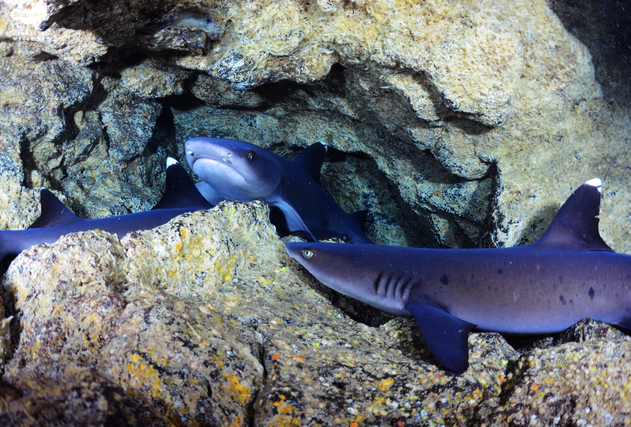 백기흉상어들도 매우 많았고, 크레바스 속으로는 닭새우들이 여러 마리 겹쳐서 자리 잡고 있었다.
