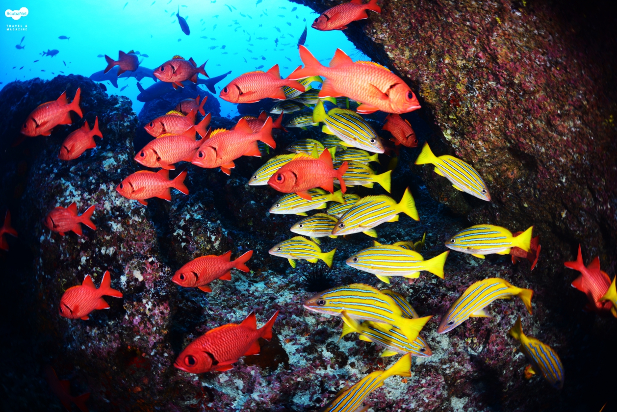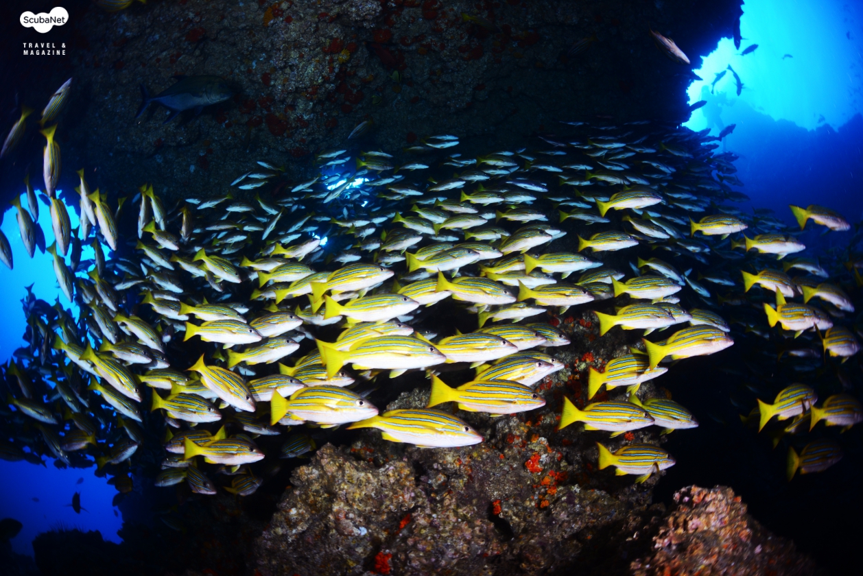 수 있었던 곳이다. 이글레이, 마블레이, 화이트팁 상어들은 물론이고, 잿방어 무리, 트레발리 무리, 스내퍼 무리 등 수많은 물고기들이 무리 지어 다녔다. 갈라파고스 상어, 귀상어, 뱀상어, 실크상어 등 상어들도 다양했다. 한시간의 다이빙이 아쉬울 정도로