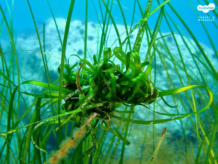 어느 가을 낙엽이 다 떨어지고 앙상한 가지만 남아 있는 나무 가지마냥 미역 줄기는 어느새 많이 녹아 없어졌다. 남은 것은 앙상한 나뭇가지처럼 손으로 건드리면 금방이라도 부러질 듯한 모양새로 나풀거리고 있었다. 간간히 지쳐가는 생명의 연장을 지루하게 이어 가듯 키 작은 모자반 역시 조금은 남아있었다. 바위 틈에 숨어서 얼핏 보면 겉모습은 무언지도 모를 만큼 잔뜩 위장한 체 스물, 스물 기어 가는 전복의 모습을 보면서 '나에게 들켜서일까?' 딱 붙어서 전혀 미동도 하지 않고 잠시 그 자리에 머물러 있다. 하얀 햇살이 물속으로 들어오면서 파란 물속에 진한 물감이라도 풀어 놓은 듯한 '잘피'의 순수한 녹색에 가만히 들여다본다. 그 곳을 터전으로 살아가는 많은 해양 생물들을 구경하면서 처음으로 잘피가 피운 '꽃'을 보고 신기해했다. 또 다른 잘피를 보니 누군가 인위적으로 리본처럼 얼기설기 엮은 모습이 있다. 누가 물속에서 이런 장난을 하였을까 생각하면서 혹시나 내가 모르는 무언가의 터전은 아닌가 또 다른 상상을 하게 된다.
