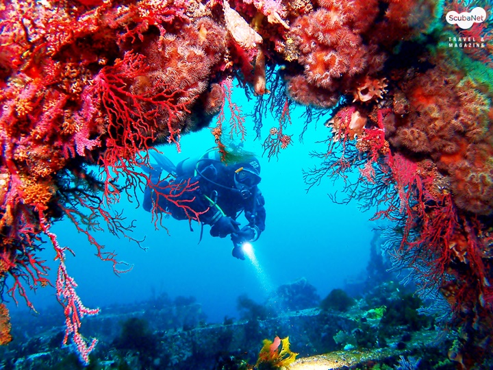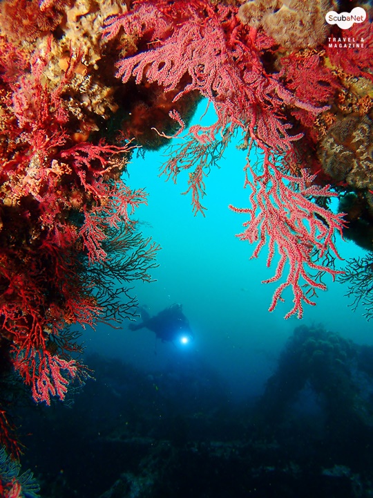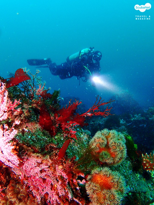 바닥에 도착하니 생각보다 시야가 나쁘진 않았다. 수중 랜턴을 비추니 역시나 영롱한 빨간색의 부채뿔산호가