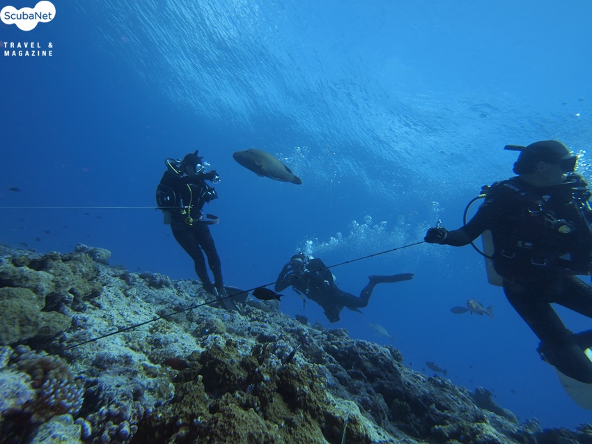 산호를 꺠 먹고 있는 바다거북을 보고 있는 다이버들