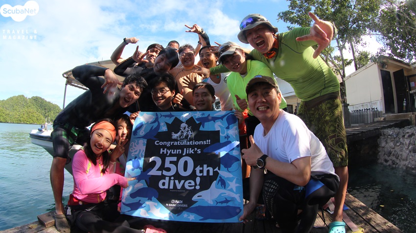 대형 수족관, 블루코너 포인트팔라우를 대표하는 포인트인 블루코너는 조류 다이빙을 즐길 수 있는 사이트이다. 비씨의 한 쪽 주머니에는 3년 전 구입한 조류 걸이를 넣었고, 바다에 띄워 놓은 부표로 조류의 세기를 확인하고 입수했다. 적당한 곳으로 자리를 잡아 하나 둘 단단한 돌에 조류걸이를 걸기 시작했다. 이 때 바로 눈 앞에 펼쳐진 풍경은 그야말로 자연 수족관이 따로 없었다. 오른편 위에는 블랙스내퍼 무리들이 사나운 표정을 하고서 시커먼 무리를 지어 지나가고 있었고, 예쁜 나비고기 무리는 꽃잎을 흩뿌린 듯 바다를 가득 메웠다. 리프 밑에는 잭피쉬 무리가 서서히 조류를 타러 올라오고 있었고 곳곳에 상어들이 우아한 꼬리를 흔들며 지나간다. 대형 황다랑어와 자이언트 트래발리도 간간히 볼 수 있었다. 그렇게 한참 평화로운 바닷속 수족관을 감상하고 있는데, 어디서 나타났는지 크기가 2m 정도인 나폴레옹 라쓰가 다이버 사이로 슥 나타나 태연하게 주변을 맴돌기 시작 하는 게 아닌가. 다이버들을 피하지 않은 덕분에 카메라로 특별한 사진을 담을 수 있었다. 사람에게 길들진 나폴레옹 라쓰의 모습이 한 편으로는 안타까웠지만 오묘하고 화려한 비늘의 무늬를 가까이서 볼 수 있어 좋았다. 하얀 달걀을 어떤 계기로 먹게 되었는지는 모르겠지만 지금은 피딩이 전면 금지 되었다.나폴레옹 라쓰를 보고 나서 산호 사이사이를 관찰하니 빨갛고 조그만 화이어 고비 세 마리가 만찬을 즐기고 있었다. 쑥스러움이 많은 이 물고기는 셔트를 서너 번 누르니, 재빨리 자기 집으로 숨어버렸다. 다시 고개를 들어보니 뿌연 모래를 뿌리며 산호를 먹는 험프헤드 페롯 피쉬 다섯 마리가 보인다. 가까이 다가가서 보니 나폴레옹 라쓰처럼 눈이 뒤로 돌아가고 이마도 불룩했는데 은근히 다이버를 경계하는 모습이었다. 팔라우에서의 다이빙이 더욱 특별했던 이유는 2백번째 다이빙을 맞이했기 때문이었다. 이를 기념하기 위해 직접 디자인한 현수막을 꺼내 들고 DSLR 카메라를 든 양욱님 앞에서 천연덕스럽게 포즈를 취하며 기념 사진을 남겼다. 때마침 좀 전에 본 나폴레옹 라쓰가 재빠르게 나의 하얀 현수막을 보고 다가와 평생 잊지 못할 수중 사진을 간직하게 된 순간이었다.