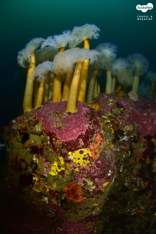 그 암반의 등줄기를 따라 마치 산맥을 이루고 있듯이 그리 멀지 않은 곳에 낙타 등처럼 높은 봉우리가 다시 솟아 올라있다고 했다. 깊게는 수심 33m에서 동해 북단에서 흔히 불수 있는 섬유세닐 말미잘 군락들이 잘 피어나 있었고, 암반 여기저기에는 동해안의 명물 대왕문어들이 각자 다른 크기를 자랑하고 있었다. 또한 곳곳의 크랙에는 조피볼락들이 무리 지어 편안하게 휴식을 취하듯 머물고 있었다. 비단멍게는 몇 개 볼 수 없었으나 대신 어른 주먹 두 개를 합쳐 놓은 크기로 멍게들이 탐스럽게 바위 여기저기에