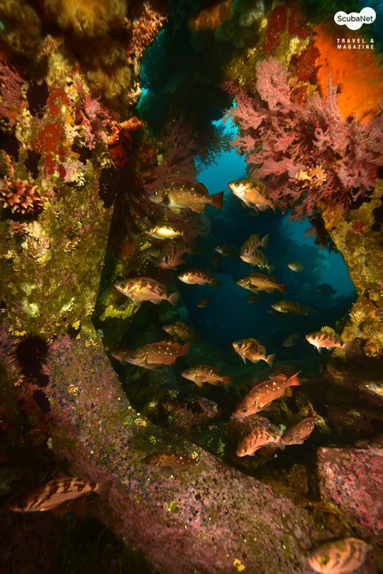 크랙을 기점으로 붉게 이어져 나가고 있었다. 그것들은 노란색의 히드라나 멍게들과 어우러져 수중사진가로서