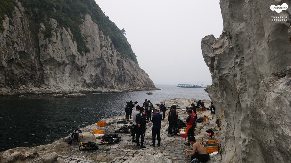 다이빙 숍들의 트럭들도 부지런히 드나들고 있었다. 문섬 새끼섬에는 이미 자리를 잡은 다이버 팀들이 있었고, 바로바로 새로운 팀들이 들어와서 새끼섬의 파식대를 채워 나갔다. 다이버의