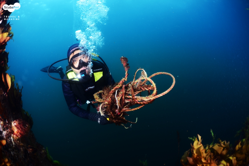 함께 다이빙한 박세화 강사는 모델을 서주기도 하다가 왕돌등대의 수중구조물에 걸려있는 로프를 수거하기 시작했다. 심심하기도 했겠지만 흉물스럽게 감겨있는 폐 로프가 환경오염은 물론 사고의 빌미가 될 수도 있기에 그러했을 것이다.