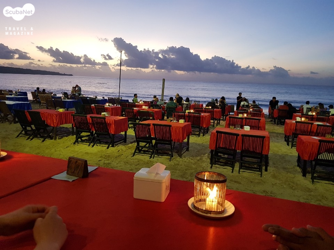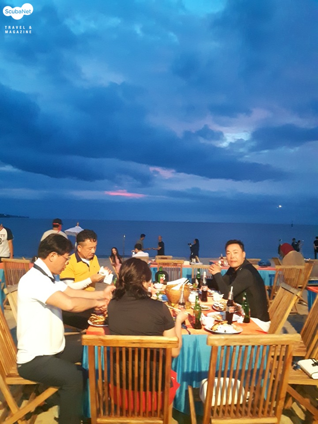 짐바란 비치에서 씨푸드를 즐기는 다이버들
