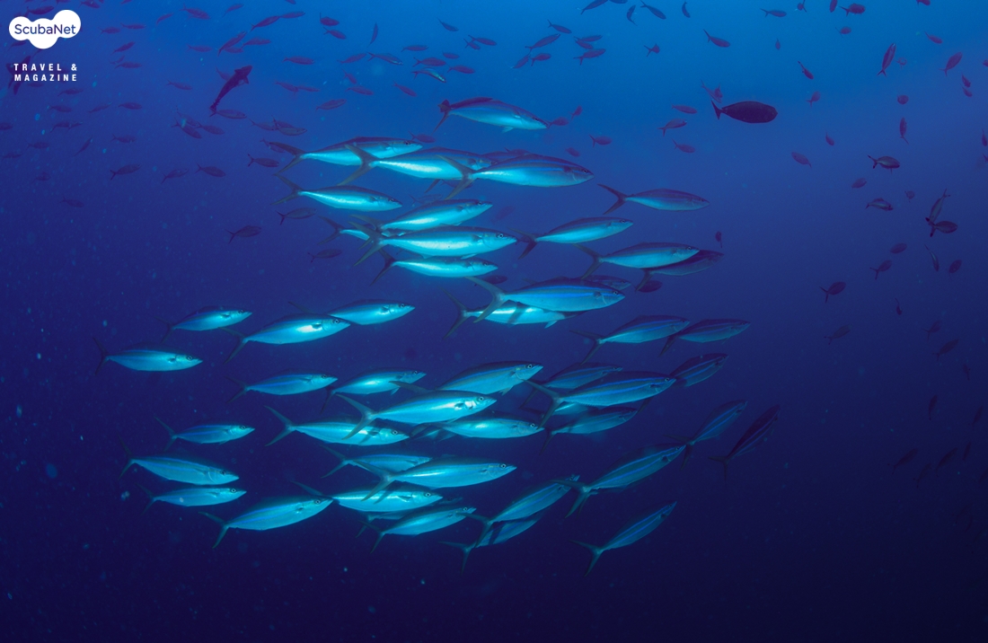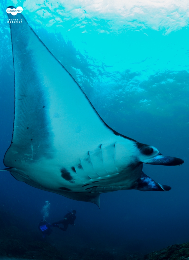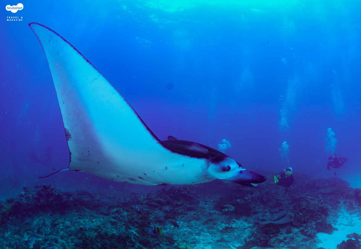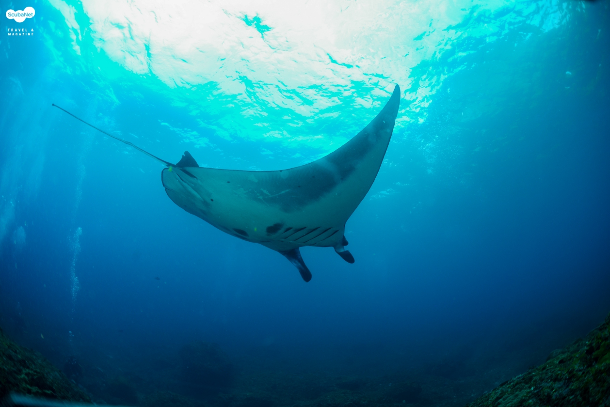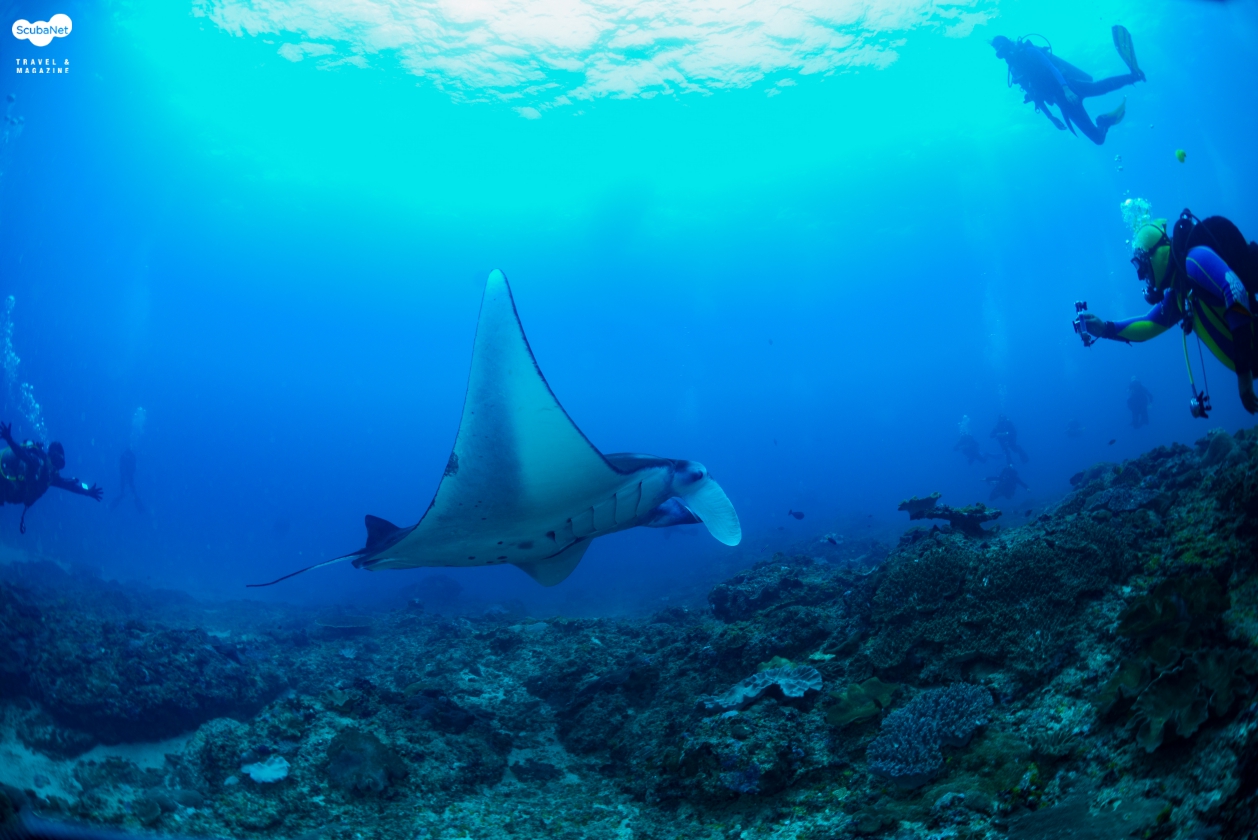 만타 레이는 다이버들 사이로 무심하게 지나다녔다.
