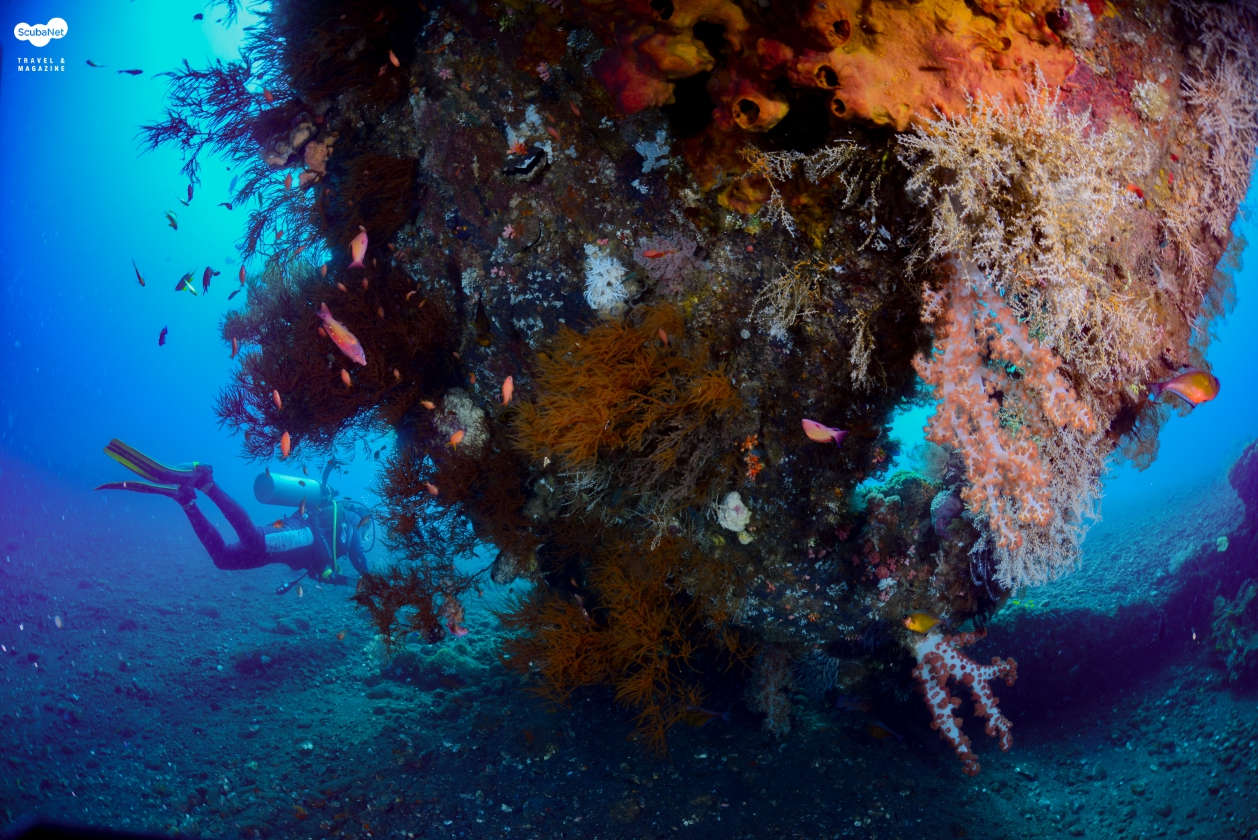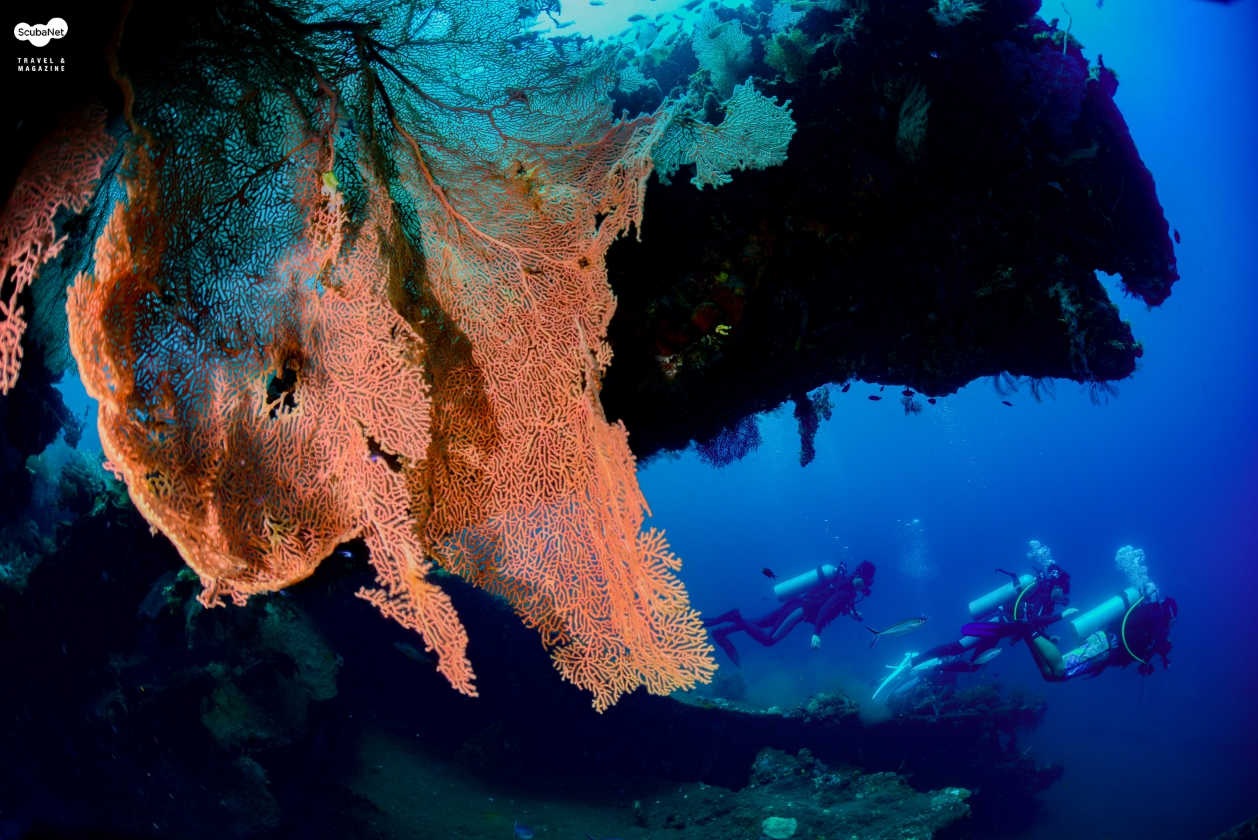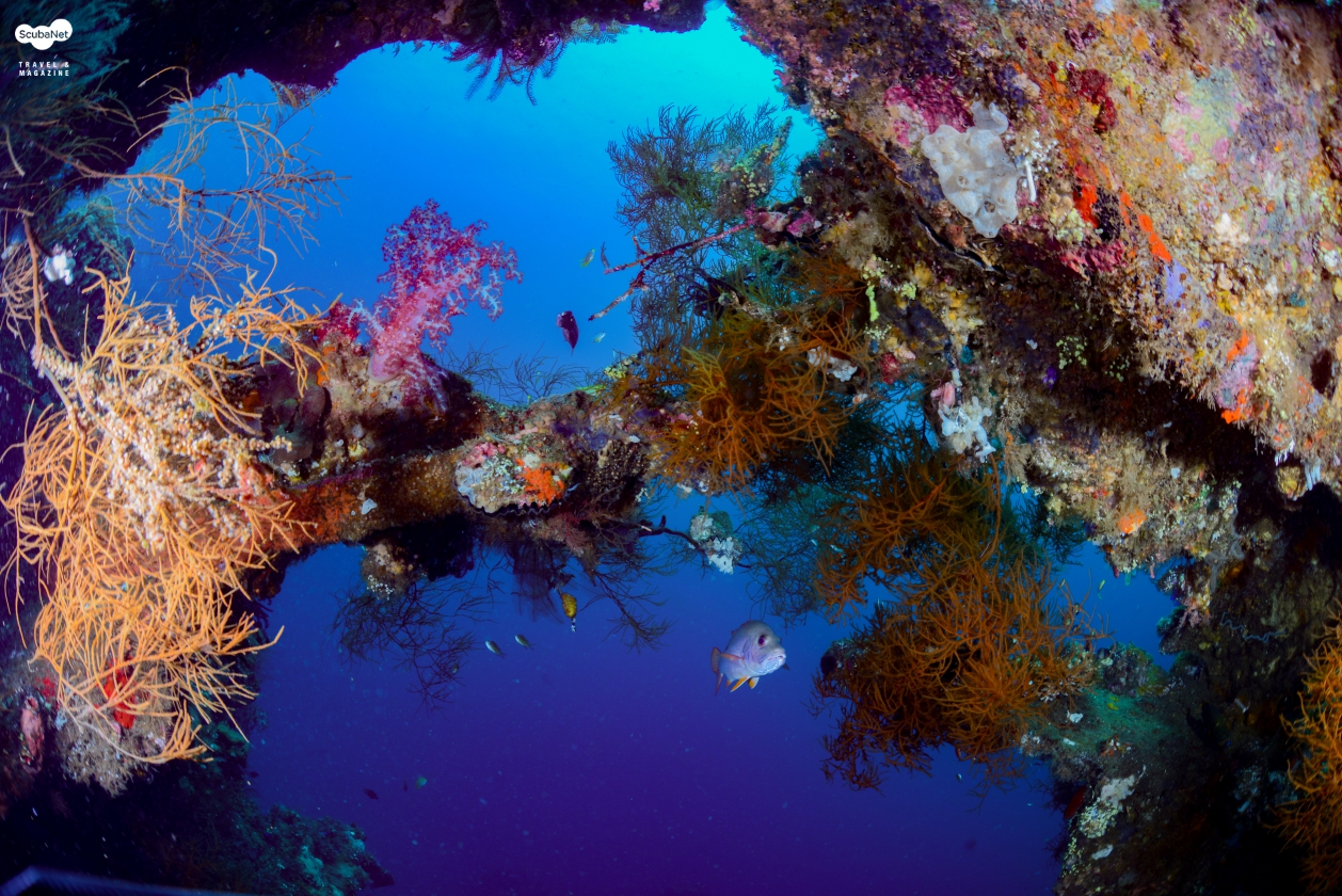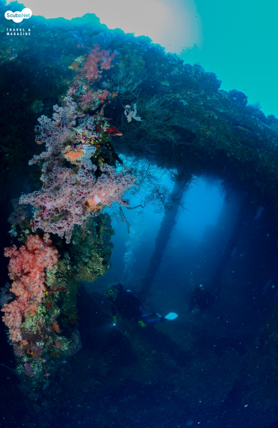 난파선 구조물에 부착되어 있는 화려한 산호 군락