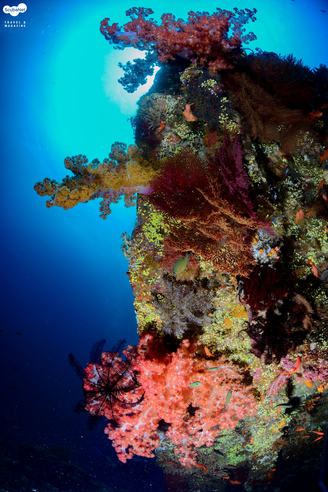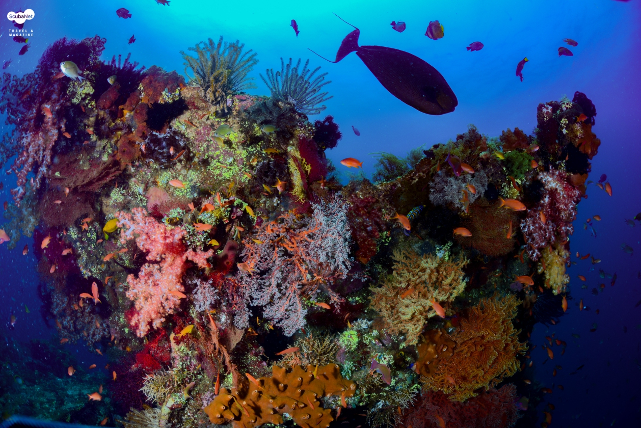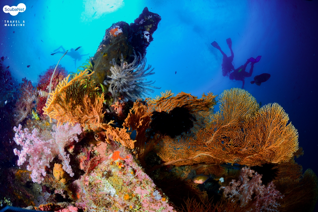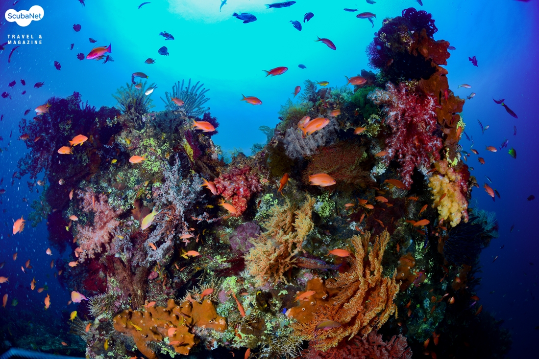 난파선 구조물에 부착되어 있는 화려한 산호 군락