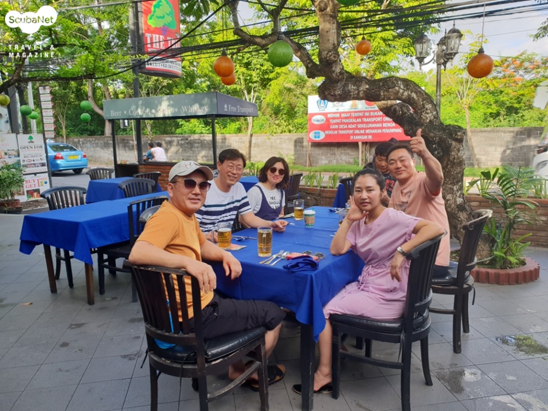 수영장 휴식과 마사지 그리고 맛난 저녁식사오전 2회 누사 페니다 다이빙을 마치고 돌아오니 오후 3시였다. 첫날이라 좀 늦게 다이빙을 나갔기 때문이었다. 수영장에서 잠깐 분위기를 잡은 다이버들은 맛사지를 받기도 하고, 한국말을 하는 가이드가 운전하는 밴을 타고 발리 관광을 나가거나 방에서 쉬기도 했다. 그렇게 휴식 시간을 보낸 후에 조금 일찍 근처 식당으로 저녁을 먹으러 갔다. 더 트리 The Tree라는 식당은 홀에 큰 나무가 있었다. 배가 고파서 피자, 케밥, 사떼, 르당, 나시고렝 등을 푸짐하게 시켰고, 빈땅 생맥주까지 주문하였다. 6명이서 푸짐하게 먹고 마셨는데도 1인당 $10 남짓이었다. 외국인 상대의 관광식당이었지만 가격은 흐뭇했다.
